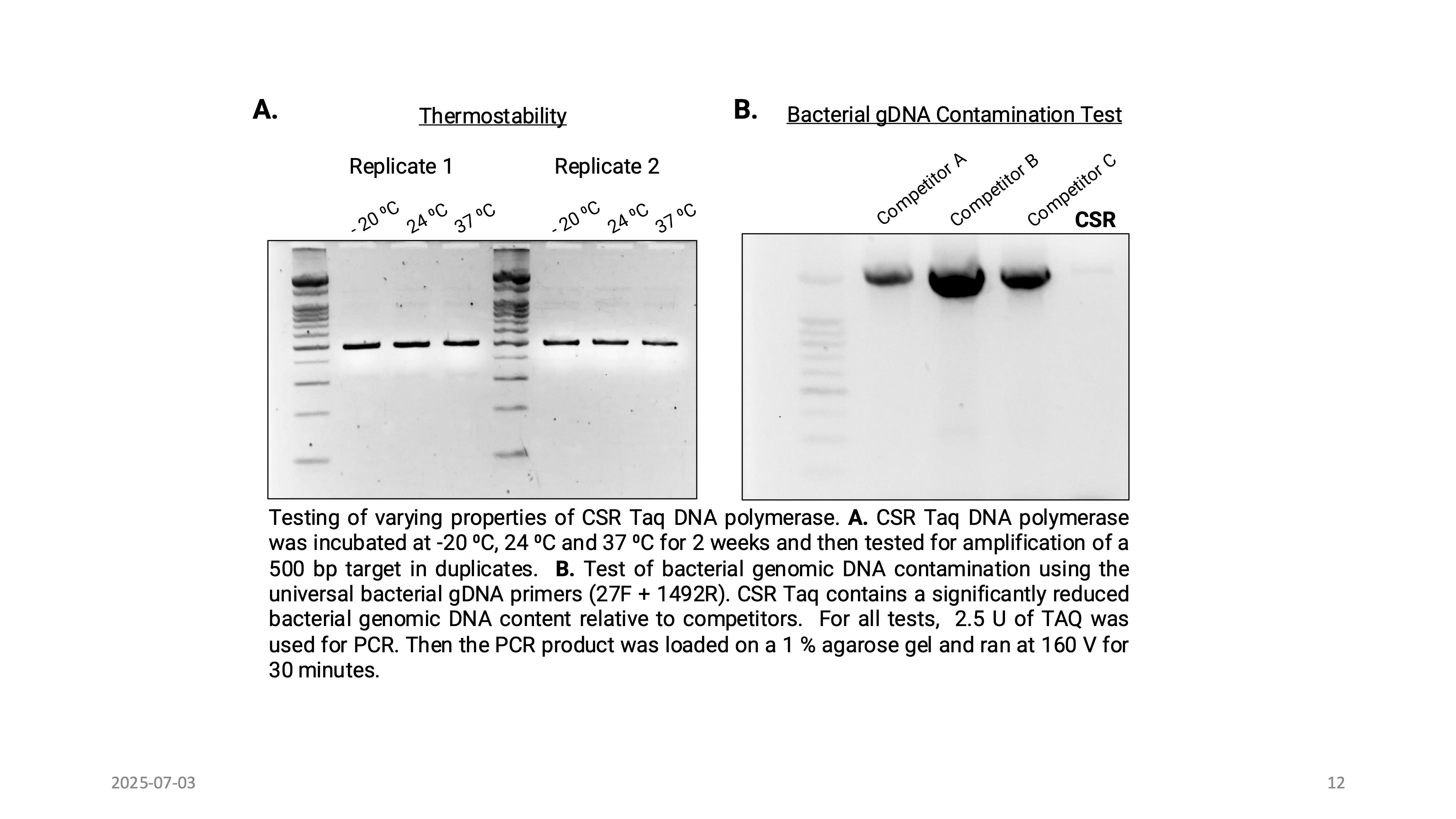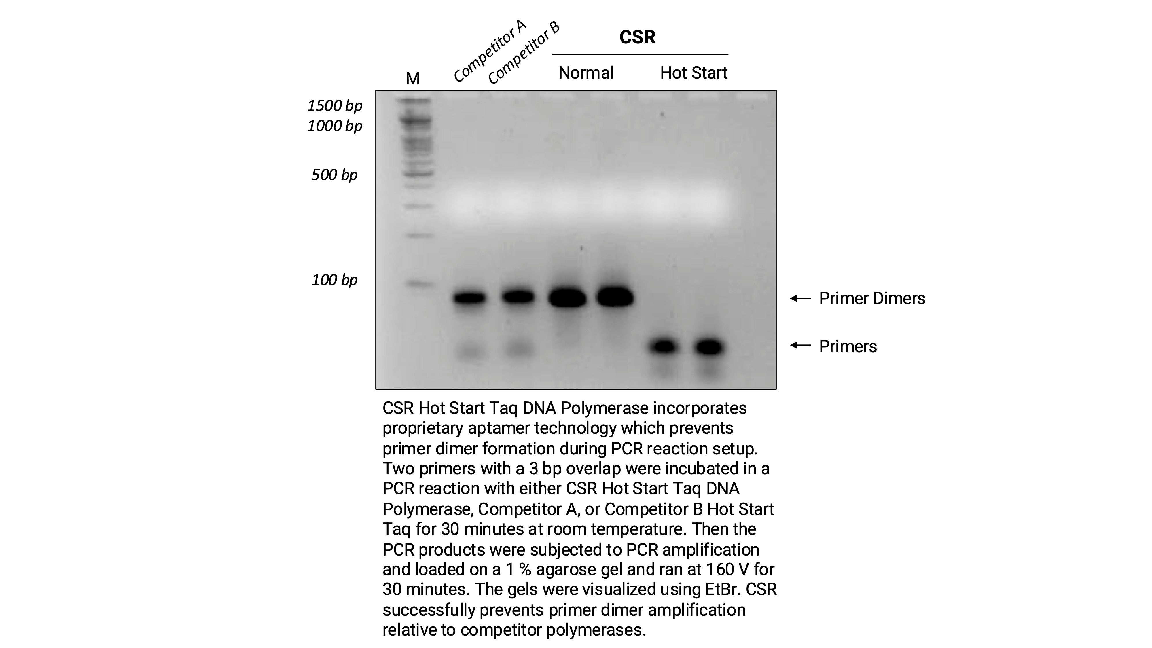 CSR Hot Start Taq DNA Polymerase reliably amplifies a wide variety of DNA templatesâincluding mouse, human, plasmid, and bisulfite-converted DNAâproducing consistent PCR products. This polymerase leaves a 3Ⲡadenine overhang, making the products well-suited for TA cloning. Verified extension capabilities reach up to 5,000 base pairs, with speeds of up to 1 kb per minute.